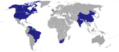 Mapa de países com embaixadas ou alta comissões da Guiana