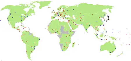 Missões diplomáticas do Japão. incluindo embaixadas (vermelho), consulados (azul) e representações oficiais (rosa)