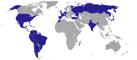 Paraguai (verde) e países que mantêm embaixadas (azul).