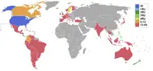 | Retiradas | Antígua, Barbados, Bophuthatswana, El Salvador, Fiji, Ilhas Maurício, Portugal, África do Sul, Ilha de São Cristóvão (São Cristóvão e Nevis), São Vicente, Suriname, Transkei |