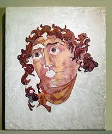 - Um jovem rodeado por um nimbo e com um globo na mão com a inscrição: "[na]mai tute[l]a S[ol] is". Neste ponto é possível ver, num local onde o gesso se desprendeu, a inscrição na camada inferior: "nama h[el]iodrom[i]s / t[utela ...]".