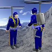 Na vida real, as mochilas-helicópteross são pilotadas com o corpo em posição vertical, mas algumas ilustradas na ficção (por exemplo em Dan Dare) são pilotadas com o corpo em posição horizontal.