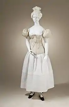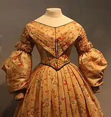 Na década de 1830, os estilos de roupas femininas da moda tinham grandes mangas "pernas de carneiro" ou gigot, acima de saias cônicas e largas, de preferência com cintura estreita e baixa, obtida por meio de uma combinação de espartilho para restringir a cintura, e mangas e saias maiores que faziam a cintura parecer menor em comparação.[5] Tecidos rígidos pesados como os brocados estavam na moda após a simplicidade estética de moda de 1795–1820, e muitos vestidos do século XVIII foram cortados em novas roupas. Havia ênfase nos ombros caídos e nas mangas largas e cheias na maior parte do braço, com uma pequena bainha no pulso, que são características dos vestidos de dia da década de 1830.