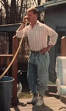- As roupas populares usadas pelos homens no início da década de 1980 incluem agasalhos,[21] suéteres com decote em V, camisas de poliéster e veludo com gola pólo, camisas esportivas, jeans de perna reta, jeans enrolado para exibir suas meias, botões de poliéster, bota de cowboy,[22] gorros e moletons. Nessa época, tornou-se aceitável que os homens usassem paletós e calças esportivas em lugares que antes exigiam um terno.[2] No Reino Unido, as calças infantis continuavam alargadas, mas apenas ligeiramente.