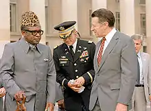 - Como alternativa ao macacão, o casaco safari, terno Nehru e terno Mao permaneceram populares na Austrália, África do Sul, Índia, China e Zaire, onde era conhecido como Abacost[29] e usado com um chapéu com estampa de leopardo semelhante o boné de Astrakhan. Ao mesmo tempo, jovens dândis africanos conhecidos como sapeur se rebelaram contra a "supressão" da moda ocidental pelo governo pós-descolonização[30] investindo em ternos caros de grife da Itália e da França e ouvindo a música do soukous do Papa Wemba.[31] Isso continuou até a deposição e morte do ditador Mobutu no final de 1990, quando o surto de uma guerra civil no Zaire resultou no desaparecimento dos sapeurs até a década de 2010.[32]