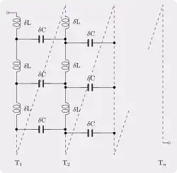 Outro exemplo em que um modelo unidimensional simples não será suficiente são as espiras de um indutor. Bobinas de fio possuem capacitância entre espiras adjacentes (e também entre espiras mais distantes, mas o efeito diminui progressivamente). Para um solenóide de uma única camada, a capacitância distribuída, na sua maioria situa-se entre espiras adjacentes, como mostrado na figura 4, entre as espiras T1 e T2, mas, para enrolamentos de múltiplas camadas e modelos mais precisos, a capacitância distribuída entre outras espiras também deve ser considerada. É difícil lidar com esse modelo em cálculos simples e, na maioria das vezes, ele é evitado. A abordagem mais comum é empacotar toda a capacitância distribuída em um elemento concentrado em paralelo com a indutância e a resistência da bobina. Esse modelo concentrado funciona com sucesso em baixas frequências, mas perde validade em altas frequências, onde a prática usual é simplesmente medir (ou especificar) um Q geral para o indutor sem associar um circuito equivalente específico. [5]