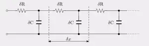 Outro exemplo do uso de parâmetros distribuídos está na modelagem da região base de um transistor de junção bipolar em altas frequências. A análise dos portadores de carga que cruzam a região base não é precisa quando a região base é simplesmente tratada como um elemento concentrado. Um modelo mais bem-sucedido é um modelo de linha de transmissão simplificado que inclui a resistência linear distribuída do material base e a capacitância distribuída com relação ao substrato. Este modelo é representado na figura 2.