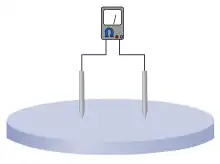 Em muitas situações, deseja-se medir a resistividade de um material em estado bruto aplicando uma matriz de eletrodos na superfície. Entre os campos que usam essa técnica estão a geofísica (porque evita ter de cavar no substrato) e a indústria de semicondutores (pelo mesmo motivo que não é intrusivo) para testar pastilhas de silício em estado bruto. [2] O arranjo básico é mostrado na figura 3, embora normalmente mais eletrodos seriam usados. Para formar uma relação entre a tensão e a corrente medidas, por um lado, e a resistividade do material, por outro, é necessário aplicar o modelo de parâmetros distribuídos considerando o material como sendo uma matriz de elementos resistores infinitesimais. Diferentemente do exemplo da linha de transmissão, a necessidade de aplicar o modelo de parâmetros distribuídos decorre da geometria do arranjo e não de qualquer consideração de propagação de ondas. [3]