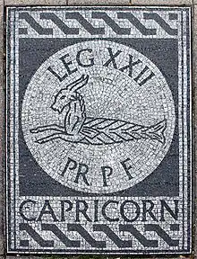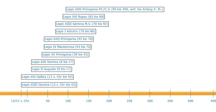 Um total de nove diferentes legiões estacionaram em Mogoncíaco na época do principado romano. Entre os anos 9 e 17 a presença simultânea de tropas atingiu o máximo, com quatro legiões e suas acompanhantes tropas auxiliares romanas, com número de soldados estimado em cerca de 50.000. A partir do ano 93 a XXII Legião Primigênia Pia Fiel (mais tarde denominada com o título honorário Antoniniana, Severiana e Constantiniana Victrix) foi a única legião a ocupar o acampamento, onde permaneceu até meados do século IV, possivelmente em parte também até o início do século V.[26] A Notícia das Dignidades, datada do primeiro terço do século V, registra no final da Mogoncíaco romana aos soldados armígeros, força militar similar a uma milícia. Esta estava estacionada dentro da cidade fortificada e subordinada ao duque de Mogoncíaco e também ao prefeito dos soldados armígeros de Mogoncíaco (praefectus militum armigerorum Mogontiaco).