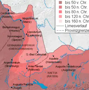 Sob Domiciano seguiu-se uma grande e duradoura expansão territorial na margem direita do rio Reno (Campos Decúmanos) e o estabelecimento de uma nova província, Germânia Superior. Esta pertencia às províncias imperiais e foi, com uma área de 93.500 km², uma das províncias de tamanho médio do Império Romano. O já existente acampamento civil de Mogoncíaco tornou-se simultaneamente capital da província, sem alterar o status legal do assentamento.[37] O ex-comandante militar do grupo de exército (Legado augusto propretor) da Germânia Superior, que também foi responsável pela administração civil, tornou-se governador consular da nova província que, como de costume, ao mesmo tempo, continuou responsável pelas tropas lá estacionadas.[38]
