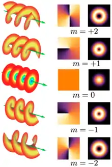 onde é a coordenada cilíndrica. Como mencionado na introdução, esta expressão corresponde a ondas com frente de onda helicoidal (ver figura acima), com um vórtice óptico no centro, no eixo do feixe.