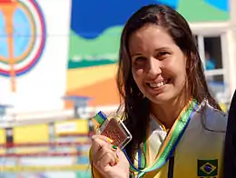 ![]() Monique Ferreira que ganhou nos 200 m livre do Pan. | |