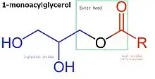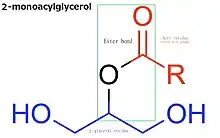 Monoglicerídeos (também: acilgliceróis ou monoacilgliceróis) são uma classe de glicerídeos compostos por uma molécula de glicerol ligada a um ácido graxo por meio de uma ligação éster.[1] Como o glicerol contém grupos de álcool primário e secundário, podem ser formados dois tipos diferentes de monoglicerídeos: 1-monoacilgliceróis, em que o ácido graxo está ligado a um álcool primário, ou 2-monoacilgliceróis, em que o ácido graxo está ligado ao álcool secundário.