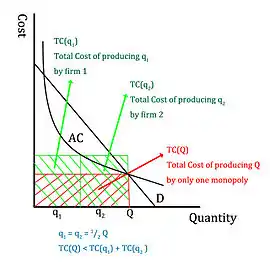 Dois tipos diferentes de custo são importantes em microeconomia: custo marginal e custo fixo. O custo marginal é o custo para a empresa de atender mais um cliente. Em uma indústria em que não existe um monopólio natural, a grande maioria das indústrias, o custo marginal diminui com as economias de escala e, em seguida, aumenta à medida que a empresa enfrenta dificuldades crescentes (sobrecarregar seus funcionários, burocracia, ineficiências, etc.) Junto com isso, o custo médio de seus produtos diminui e aumenta. Um monopólio natural tem uma estrutura de custos muito diferente. Um monopólio natural tem um alto custo fixo para um produto que não depende da produção, mas seu custo marginal de produzir mais um bem é praticamente constante e pequeno.