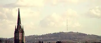 No topo da colina há uma antena que atinge uma altura de 364 m e transmite sinais de televisão e rádio: