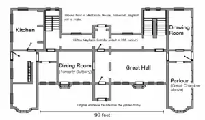 Em nenhum palácio da Era Isabelina existiam corredores; os quartos levavam directamente de um ao outro. Isso mudou no século XVIII, quando a fachada duma mansão demolida na aldeia de Clifton Maybank foi usada na renovação de Montacute House, o que veio providenciar os necessários corredores. Agora, com o novo frontispício no sítio, a casa estava virtualmente virada: a fachada vinda de 'Clifton-Maybank' tornava-se na entrada principal do palácio, e a impressionante fachada antiga tinha agora uma vista panorâmica para um terreno relvado rodeado por flores, especialmente na entrada original do pátio. Os pequenos pavilhões que flanqueavam a portaria original ainda resistem, lembrando duas cottage gémeas, com os seus telhados em ogiva.