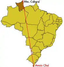 Com base em dados oficiais, é correto afirmar que os pontos extremos norte e sul do Brasil são o monte Caburaí, em Roraima, e o arroio Chuí (que encontra-se no município de Santa Vitória do Palmar e não no município do Chuí), no Rio Grande do Sul, corrigindo portanto a conhecida expressão "do Oiapoque ao Chuí", que foi provavelmente criada para se referir aos corpos d'água mais ao norte e mais ao sul do Brasil, levando-se em conta o ponto de vista costeiro.