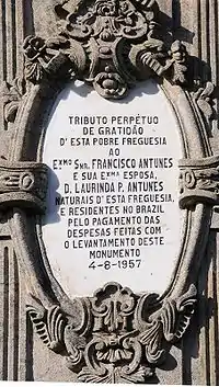 Face 3 "Tributo perpétuo de gratidão d´esta pobre freguesia ao exmo snr Fransisco Antunes e a sua exma esposa D. Laurinda P. Antunes naturais d´esta freguesia, e residentes no Brazil pelo pagamento das despesas feitas com o levantamento deste monumento. 4-8-1957"