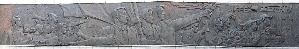 Os três punhos são cercados por um anel, simbolizando a "unidade unicista do líder, do partido e do povo". A inscrição diz: "Viva o líder e organizador das vitórias do povo da Coreia, o Partido dos Trabalhadores da Coreia!" (Chosŏn'gŭl:조선인민의 모든 승리의 조직자이며 향도자인 조선로동당 만세!; MR:Chosŏninminŭi modŭn sŭngniŭi chojikchaimyŏ hyangdojain chosŏllodongdang manse!). O diâmetro do anel é de 50 metros no exterior e 42 metros no interior. O anel é feito de 216 blocos. Os 216 blocos e o diâmetro interno de 42 metros simbolizam a data de 16 de fevereiro de 1942, a suposta data de nascimento de Kim Jong-il. Na realidade, ele nasceu em 16 de fevereiro de 1941 na União Soviética.[13]