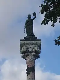 - O corpo superior é constituído por uma grande coluna em mármore vermelho com capitel branco que têm escrita a data de construção (1903). Por cima está uma estátua de bronze com cinco metros de altura e cinco toneladas de peso, uma alegoria de Navarra, coroada em recordação da história como reino, que segura na mão direita uma cadeia partida, das que formam o escudo de Navarra, e na mão esquerda a Lei Foral.