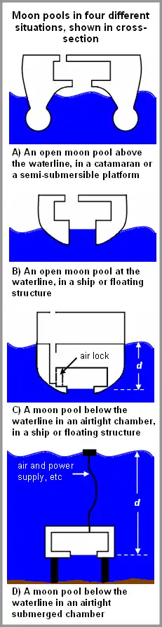 Numa plataforma de perfuração, a moon pool fica geralmente acima do nível do mar e é aberta para o ar acima e abaixo. O navio de investigação Western Flyer (na imagem) possui uma moon pool acima da linha de flutuação, tal qual o seu design SWATH (casco-duplo) permite. Veja a parte A do diagrama. A câmara acima da moon pool também está conectada ao ar aberto, através de escadas e passagens.