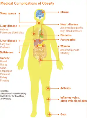 Muitos cânceres ocorrem com maior frequência em pessoas com sobrepeso ou obesas. Um estudo do Reino Unido descobriu que aproximadamente 5% dos cânceres são causados pelo excesso de peso.[50] Esses cânceres incluem:[51]