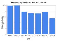 A associação entre obesidade e depressão é mais forte nas pessoas com obesidade mais grave, nas mais jovens e nas mulheres.[55] Entretanto, a taxa de suicídio diminui com o aumento do IMC.[54] Da mesma forma, a perda de peso por meio de cirurgia bariátrica está associada ao aumento do risco de suicídio.[56]