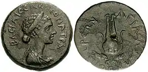 - [21] diz que não está claro se Antônio e Cleópatra foram realmente casados. [20] Afirma que o casamento selou publicamente a aliança de Antônio com Cleópatra e, em um desafio a Otaviano, se divorciaria de Otávia em 32 a.C. Moedas de Antônio e Cleópatra os descrevem da maneira típica de um casal real helenístico, como explicado por [21].