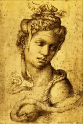 Representações retratando Cleópatra nua em pé e envenenada por uma áspide tornaram-se comuns na cura da Renascença italiana.[130] O artista veneziano do século XVI Giovanni Maria Padovano criou dois relevos em mármore do suicídio de Antônio e Cleópatra, bem como várias estátuas nuas de Cleópatra sendo mordidas pela áspide que foram parcialmente inspiradas em esculturas romanas antigas, como a Vênus Esquilina.[131][nota 17] Baccio Bandinelli criou um desenho de Cleópatra, na qual estava nua e em pé enquanto cometia suicídio, que serviu de base para uma gravura semelhante de Agostinho Veneziano.[130] Outra gravura de Veneziano e um desenho de Rafael descrevendo o suicídio de Cleópatra enquanto dormia foram inspirados na antiga greco-romana Ariadne Adormecida, que na época se pensava representar Cleópatra.[132][133] Obras do Renascimento francês também retratam Cleópatra dormindo enquanto pressionam uma cobra no peito.[134] Michelangelo criou um desenho a giz preto do suicídio de Cleópatra por picada de áspide por volta de 1535.[135] O pintor barroco do século XVII Guido Reni retratou a morte de Cleópatra por picada de picada de cobra, embora com uma cobra muito pequena se comparada a uma cobra egípcia real.[136]