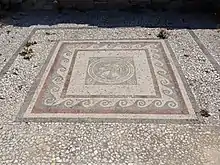 A Casa do Tridente contém painéis peristyle com o motivo de um golfinho negro situado em torno de uma âncora vermelha e tridentes pretos contra um fundo branco. O tema sugere que os proprietários da casa estavam de alguma forma ligados às atividades marítimas.[59] Estes simples mosaicos bidimensionais contrastam com os mosaicos helenísticos multicoloridos, finamente detalhados e tridimensionais de figuras e motivos.[55] Eles são talvez comparáveis ou mesmo ligados aos mosaicos de pavimento preto e branco que aparecem na Itália romana algumas décadas depois.[55]