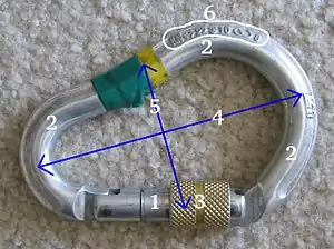 Assim, os valores médios para um mosquetão particular podem ser, por exemplo, 22 kN, 8 kN e 10 kN (resistência longitudinal fechado, resistência transversal fechado e resistência longitudinal aberto).