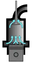 Isto não só impede que a mistura ar / combustível de viajar diretamente para fora da porta de escape, mas também cria uma turbulência turbilhão que melhora a eficiência de combustão, potência e economia. Normalmente, um defletor de pistão não é necessário, pelo que esta abordagem tem uma vantagem distinta sobre o regime de fluxo cruzado (acima).