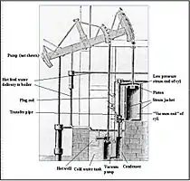 O motor a vapor de James Watt era muito parecida com a de Newcomen, todavia existia uma segunda câmara ("câmara da condensação"), onde era criado o vácuo. Esta modificação foi muito eficaz, pois permitia que o pistão ficasse à mesma temperatura que o vapor, logo não haveria troca de calor entre eles, fazendo com que não houvesse perda de energia. Outra vantagem seria a de resfriamento, pois a câmara de condensação separada poderia ficar em uma temperatura mais baixa, necessitando de um resfriamento menor.[carece de fontes]