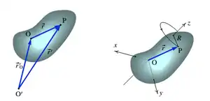 A figura ao lado mostra um corpo rígido em movimento. O ponto O' é a origem de um referencial externo fixo e o ponto O é um ponto do corpo, usado como origem de um referencial que se desloca com o corpo.