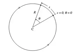 No caso em que o raio de curvatura é constante e o centro de curvatura permanece fixo, a trajetória é uma circunferência e o movimento é circular, como no caso ilustrado na figura abaixo. Para determinar a posição em cada instante, bastará um único grau de liberdade, que poderá ser a distância percorrida ou o ângulo .[2]