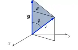 Observe-se que na figura anterior o triângulo sombrejado tem base igual a e altura igual a ; assim sendo, a sua área é igual a metade do módulo do produto vetorial da velocidade angular pelo vetor posição:
