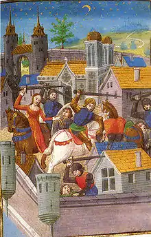 Mulheres medievais ajudando a defender a cidade de um ataque.