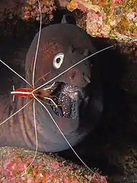 A Moreia-preta é uma espécie bentônica que habita fundos rochosos. usualmente fendas entre rochas e pequenas grutas. Espécie com padrão de cor marmoreado. O corpo é castanho com grandes manchas amarelas cada uma contendo pequenas manchas castanhas formando uma rosa. Espécie territorial que se alimenta de cefalópodes e peixes. Reprodução ovípara. Possui interesse comercial.