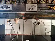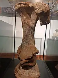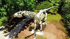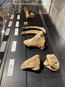 Glossotherium outra espécie de preguiça, menor do que a Eremotherium laurillardi, que atingiria, em pé, até dois metros de altura e pesava cerca de 1,5 toneladas[5]. Entre os fósseis em exposição no MHNMT deste animal estão: dentes, vértebras, costelas e tíbia (veja os fósseis da Glossotherium na coleção digital do MHNMT).