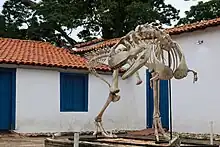 Eremotherium laurillardi ou preguiça-gigante que, em pé, chegaria até os seis metros de altura e poderia pesar até 5 toneladas[3][5]. Entre os fósseis Deste animal, o MHNMT expõem para o público a réplica do fragmento do fêmur, osteodermas, metacarpos, metatarsos (veja os mais de 100 fósseis da Eremotherium laurillardi na coleção digital do MHNMT).
