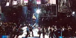 "Music" serviu como a música final da Hard Candy Promo Tour. Madonna usou um terno preto justo e um top de renda e iniciou a canção à capela na frente do palco, com seus dançarinos surgindo logo em seguida através de uma falsa porta de metrô. A apresentação terminou com a cantora correndo até a porta e desaparecendo por trás dela.[97] A faixa fez parte do segmento Old School da Sticky & Sweet Tour (2008–09), sendo incluída como o último número do bloco, na qual a intérprete apresentou a mesma versão da turnê promocional, com demonstrações de "Last Night a DJ Saved My Life", de Indeep, no início da performance, misturando-a também com "Put Your Hands Up 4 Detroit", de Fedde le Grand. Nos telões, foram exibidos uma estação de metrô de Nova Iorque pintada de graffiti.[98] O figurino de Madonna foi composto por shorts de academia com longas meias e tênis, sendo uma referência aos primeiros dias de sua carreira na cidade.[99][100] As apresentações realizadas nos dias 7 e 8 de dezembro de 2008 no Estádio River Plate em Buenos Aires, Argentina, foram gravadas e lançadas como parte do álbum ao vivo e DVD de mesmo nome da excursão.[101]