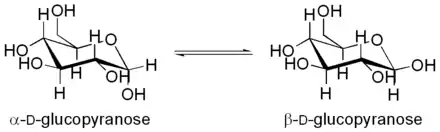 Açúcares cíclicos exibem mutarrotação quando se transformam nas suas formas anoméricas α e β .[2]