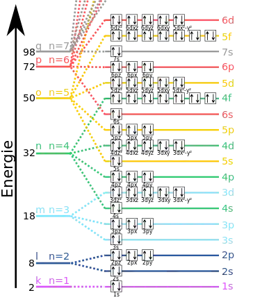 Se um átomo, íon ou molécula está no menor nível de energia possível, ele e seus elétrons são ditos em estado fundamental. Se estão no maior nível de energia, são ditos excitados, ou qualquer elétron possui uma energia maior que o estado fundamental está excitado. Tal espécie pode ser excitada a um nível de energia maior ao absorver um fóton cuja energia é igual a diferença de energia entre dois níveis. Por outro lado, uma espécie pode ir para um nível de energia inferior ao emitir espontaneamente um fóton com energia igual a diferença energética. A energia de um fóton é igual à constante de Planck (h) vezes a sua frequência (f) e, portanto, é diretamente proporcional à sua frequência, ou inversamente proporcional ao seu comprimento de onda (λ).