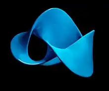 ![]() Descrição quadrada da configuração do nó figura oito. | ![]() Representação simétrica gerada por equações paramétricas. | ![]() Superfície ilustrando nó figura oito |