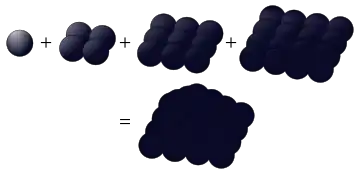 Representação geométrica de 30, o quarto número pirâmidal quadrado: 1 + 4 + 9 + 16 = 30