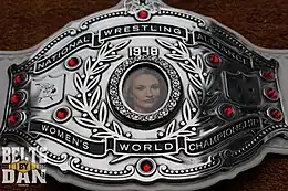 ![]() A placa central do NWA World Women's Championship, apresentada em 30 de setembro de 2019. Na foto no centro está a ex-campeã Allysin Kay; a foto é atualizada a cada troca de campeã. | |||||||||||||||