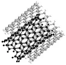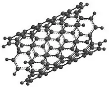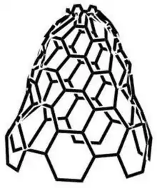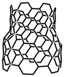 Já os NCPS são mais parecidos com os fulerenos convencionais do que seus análogos com múltiplas paredes, sendo constituídos por uma única folha de grafeno enrolada (Figura 6). Eles são formados na fase gasosa do processo de arco elétrico e uma diferença fundamental é o fato de precisarem de um catalisador para sua formação, em geral, um metal de transição. Os NCPS despertam maior interesse pela comunidade científica quando comparados com os NCPM, já que apresentam uma gama mais diversificada de possibilidades.[5]