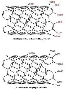 Um exemplo é a metodologia desenvolvida por Smalley e colaboradores,[8] que consiste no tratamento de NCPS com H2SO4 : HNO3, dando origem a NCPS com extremidades abertas, contendo grupos carboxila nas extremidades e na parede lateral (Figura 7). Os grupos carboxila podem ainda sofrer outros tipos de reações, que levam à formação de ésteres, cloretos de acila e amidas.