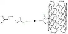 Assim como nos fulerenos, a distorção do sistema π dos carbonos sp², torna as paredes do nanotubo mais susceptíveis a reações do que sistemas aromáticos convencionais. Dessa forma, uma variedade modificações como halogenação, hidrogenação, adições nucleofílicas e reações radicalares são descritas com NC. Um exemplo bastante empregado para esse tipo de modificação é a formação de ilíideos azometina pela condensação com aminoácidos e aldeídos (Figura 8).
