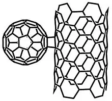 Os NC podem ainda apresentar formas toroidais (em inglês conhecidos como nanotori), com diâmetros entre 300 e 500 nm e podem dar origem aos nanotubos geminados com fulerenos (em inglês conhecidos como nanobuds) (Figura 12). Estudos por microscopia eletrônica de transmissão já revelaram a existência de NC unidos covalentemente a fulerenos C42 e C60. Esse nanomaterial apresenta um grande potencial para possíveis aplicações, já que o híbrido pode fornecer novas estratégias de modificações químicas em NC.